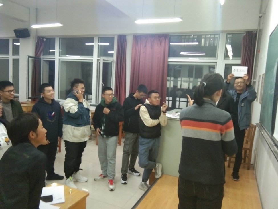 本次心理班会共分为三个阶段,每个阶段都有趣味性的游戏,在这种趣味性,任务性中,带动同学们的积极性,首先是热身阶段:为自己鼓掌的小游戏:预估自己一分钟鼓掌次数,目的让新生体验预期与现实的差异,学会客观的分析自己的状况,给自己一个合理的可达到的预期。“我知道”小游戏:组内互相交流,五个话题结束之后,由其他同学复述这位同学交流时所说的内容,可以激活同学们的注意力,关注自己的同时也关注别人,增强团队间的成员熟识,有利于团队的形成。第一阶段热身阶段结束,谈谈感受后进入下一阶段,过渡阶段。过渡阶段就分为很多个游戏了,“信任之旅”,“集体登陆”,“人体字母”,“人椅破冰”,“快乐传递” ,“信心启迪”,“你说我猜”,目的都是在最短的时间内消除同学间的陌生感,建立团队间的默契。最后就是结束阶段了:大家一起绘制了团体树,并播放歌曲《相亲相爱一家人》,最后在一片欢声笑语中结束了本次活动。