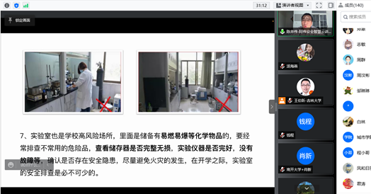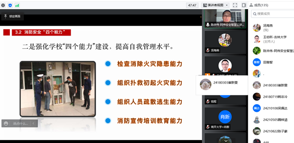 yl23455永利集团“人文关怀与科学素养”第十四期讲座于4月5日晚19点在线举行,受学院党委书记衣长涛邀请,高级工程师、一级注册安全评价师、吉林省元麟安全科技有限公司总工程师陈井伟为我院师生带来防火安全主题讲座《高校中的消防安全》。我院领导、各系教师、实验员、行政人员、辅导员,以及各学历层次的同学共计130余人参加了讲座。本期讲座旨在响应学校安全生产委员会《关于加强学校疫情防控期间安全生产工作的通知》精神,落实疫情防控期间安全生产工作要求,进一步提高师生消防安全意识,杜绝消防隐患,一起守护平安。讲座由学院研究生综合办公室汤海燕老师主持。