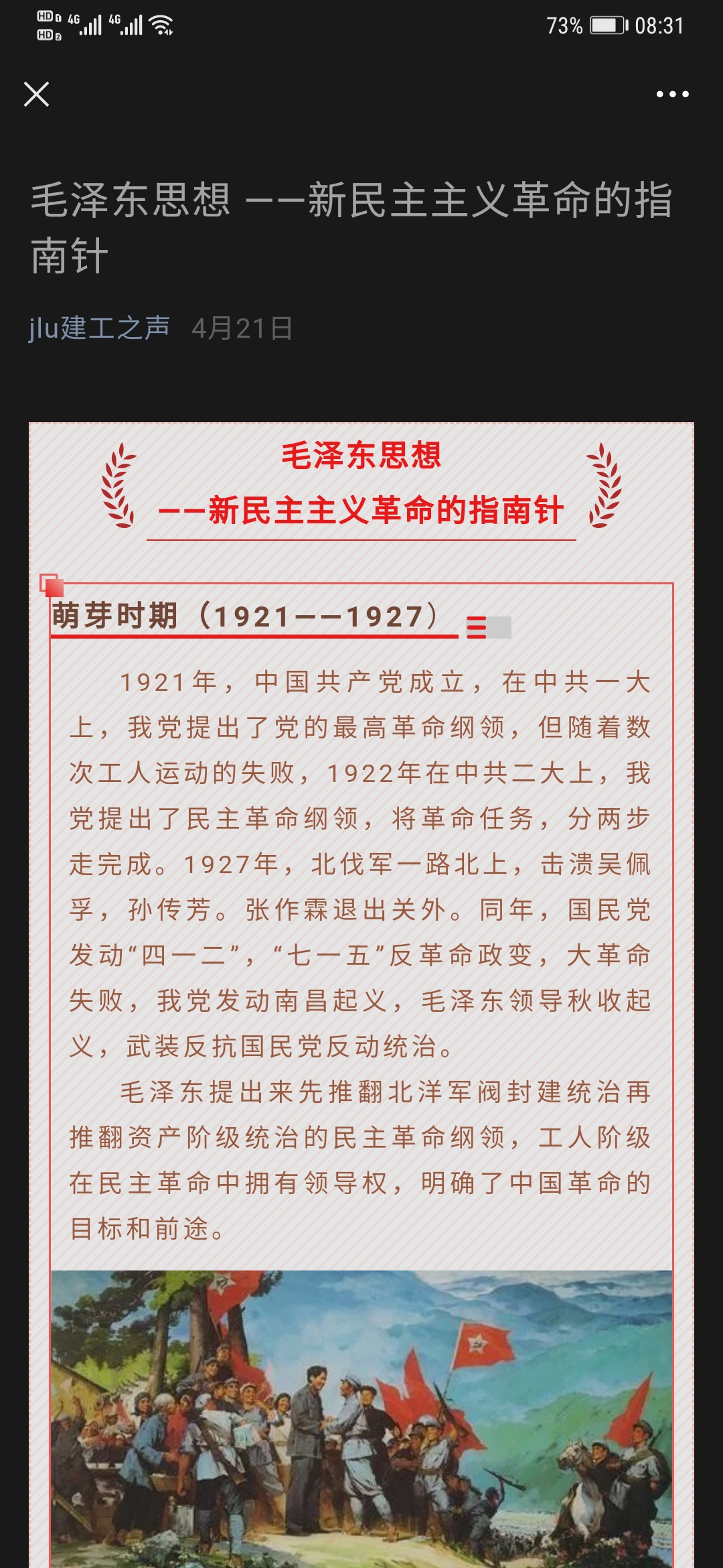 学院党委利用学院水工楼大厅电子屏幕,定期投送党史专题教育幻灯片,目前已经投送七个专题的学习内容;充分利用新媒体平台,在学院微信群中开展“党史百年天天读”活动,每天为教职工推送“党史上的今天”相关内容;利用学院“建工之声”微信公众平台,开展“毛泽东思想-新民主主义革命的指南针线上学习活动,以及开天辟地-中国共产党第一次全国代表大会线上学习活动。