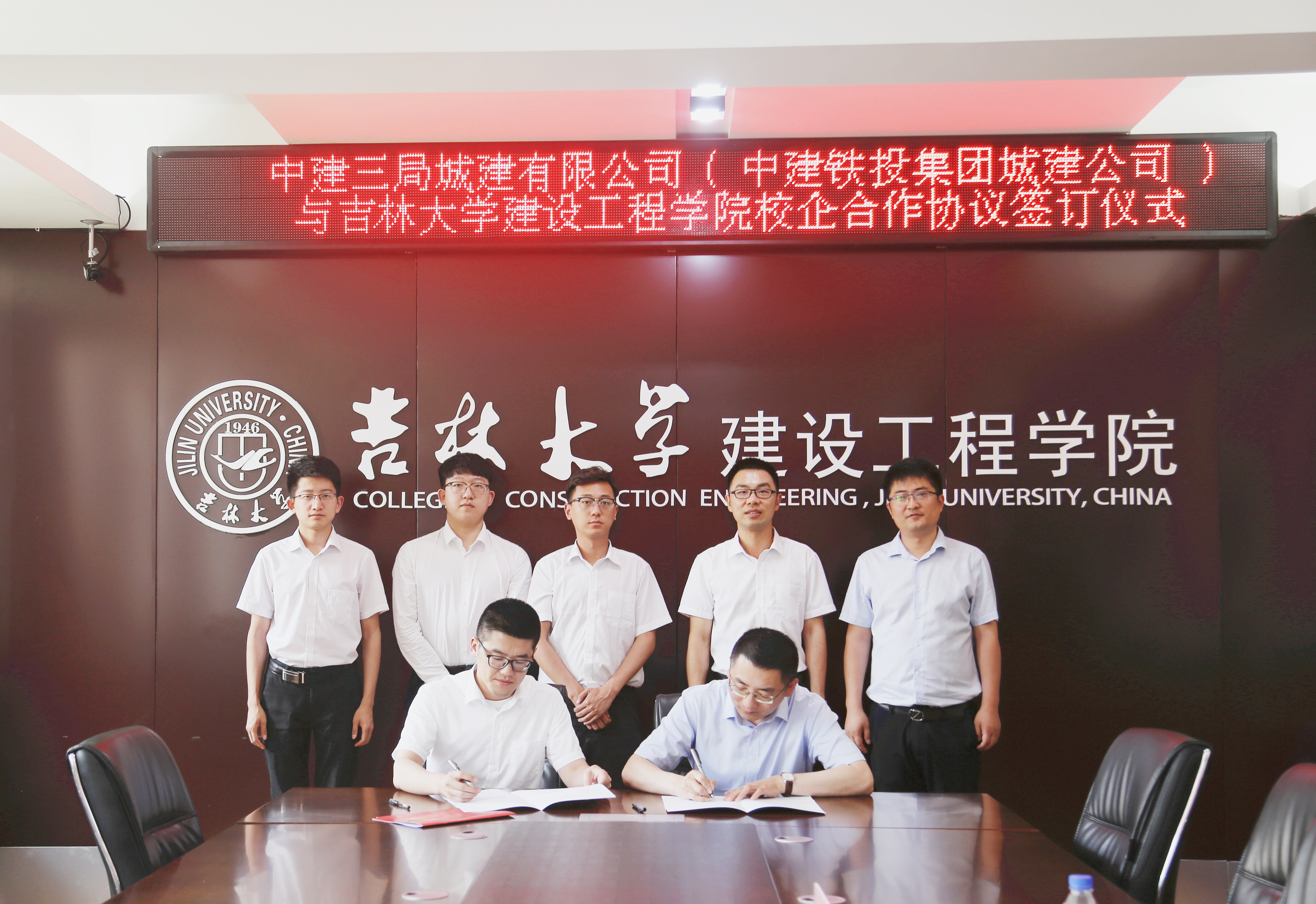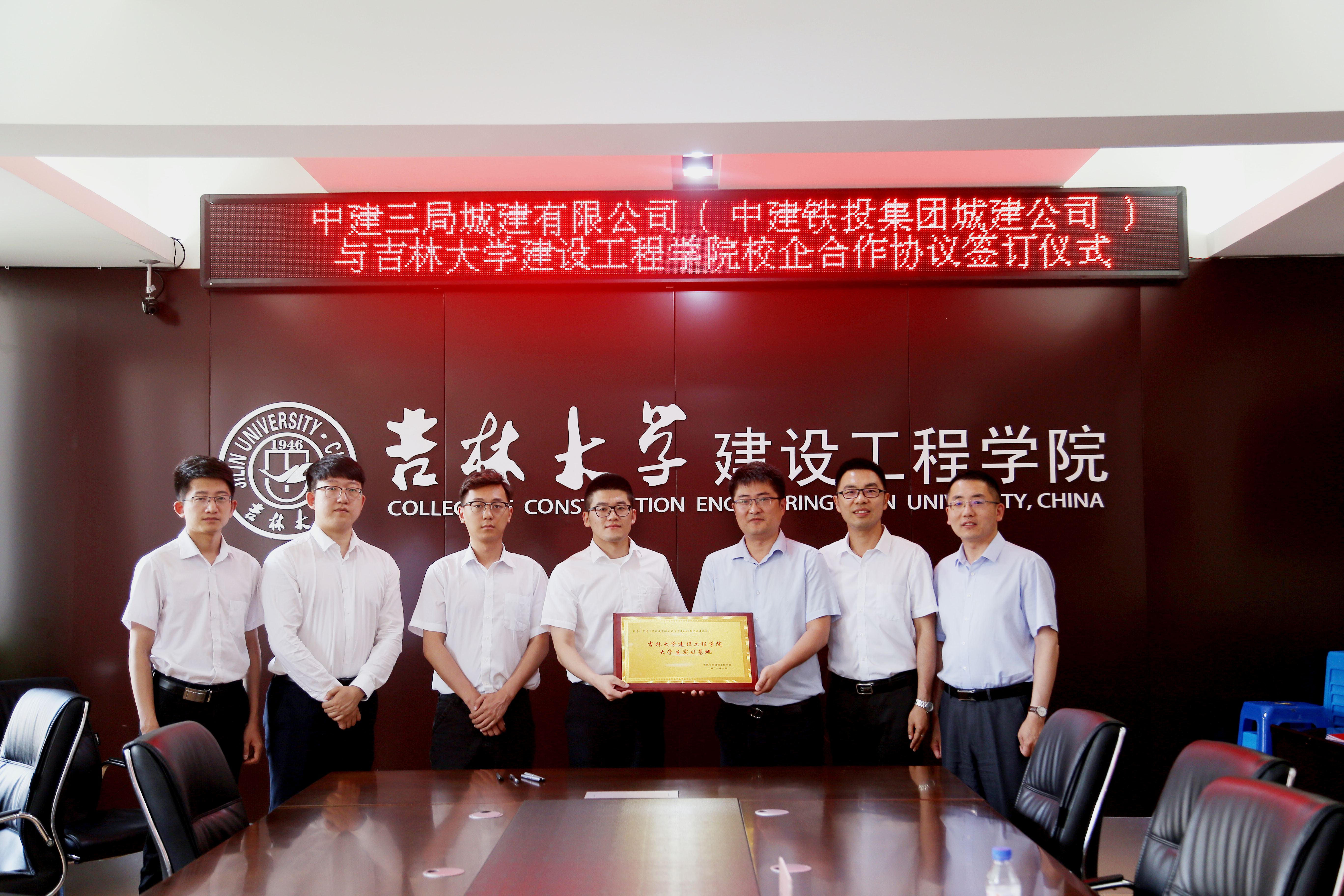 在会谈中,双方对合作模式、学生就业、人才发展环境等问题进行了进一步的交流,并达成初步共识。随后,双方共同签署校企合作实习基地备忘录,张文副院长代表学院进行“中建三局城建有限公司(中建铁投集团)-yl23455永利集团校外生产实习实践基地”授牌。